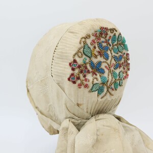 Weiße Trachtenhaube mit Perlenstickerei und Dekorativem Band in Creme