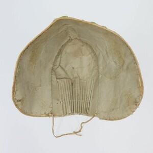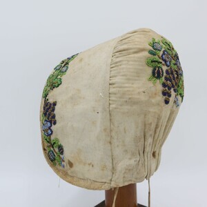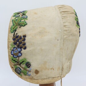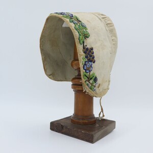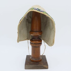 Weiße Trachtenhaube aus Leinen mit floraler Perlenstickerei in Grün-, Braun- und Blautönen die vermutlich Weinreben darstellen sollen. Eine weiße Kordel verziert den Rand der Krempe, innen ist die Haube komplett mit Pappe verstärkt. Obenherüber wurde ein creme/goldfarbenes Seidenband angebracht das hinten zusammengeführt ist und von dort in zwei Schlaufen und zwei Bändern herunterhängt.