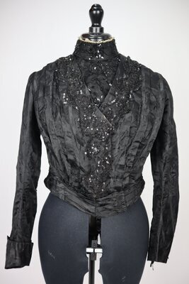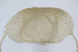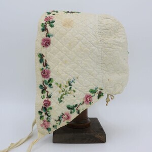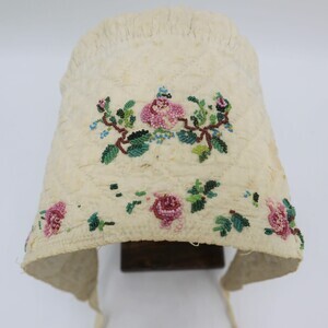 Gequiltete weiße Trachtenhaube aus Leinen in Form einer "Boak" aus der Eifel. Die gesamte Haube ist im Schachbrettmuster gesteppt, am vorderen Rand sind die Stiche in Reihen angeordnet. Krempe und Deckel sind mit rosa Blumen und grün-blauen Blättern mit gelben Akzenten aus Perlen bestickt. Den Fotos ist ein Schnittmuster zugefügt.