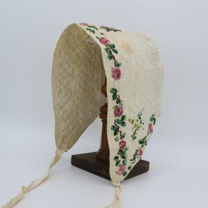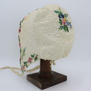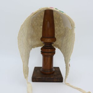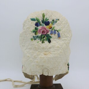 Gequiltete weiße Trachtenhaube aus Leinen in Form einer "Boak" aus der Eifel. Die gesamte Haube ist im Schachbrettmuster gesteppt, am vorderen Rand sind die Stiche in Reihen angeordnet. Krempe und Deckel sind mit rosa Blumen und grün-blauen Blättern mit gelben Akzenten aus Perlen bestickt. Den Fotos ist ein Schnittmuster zugefügt.