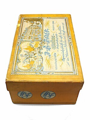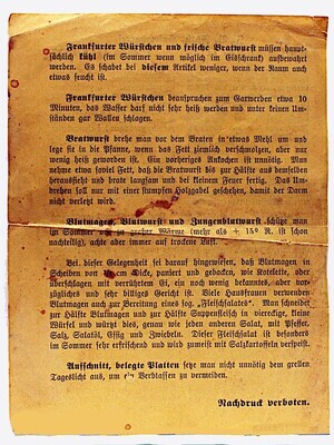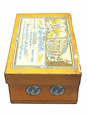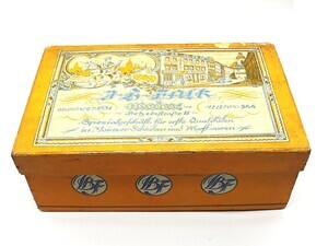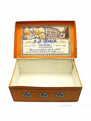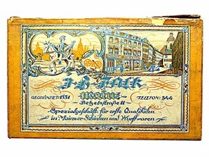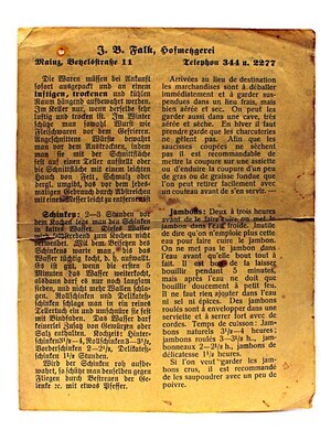 Originalschachtel des Mainzer Schinkens (Jambon de Mayence) der Metzgerei Falk, Mainz, gegründet 1831, Betzelstr. 11, Spezialgeschäft für erste Qualitäten in Mainzer-Schinken und Wurstwaren. Die Schachtel wird vor 1920 datiert. Innenliegend befindet sich auf einem Blatt Papier außerdem ein beigelegtes Rezept für gekochten Schinken.