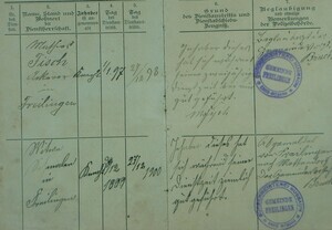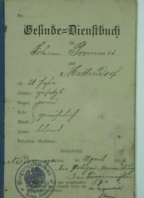 Das Gesinde-Dienstbuch wurde im April 1897 für den damals 21-jährigen Johann Trommes vom Bürgermeisteramt Bitburg ausgestellt. Dem Dokument ist zu entnehmen, dass Johann vom 1.1.1897 bis zum 27.12.1900 zwei mal als Knecht in der Gemeinde Freilingen, (ein Ortsteil der Gemeinde Blankenheim Ahr) bei insgesamt zwei verschiedenen Arbeitgebern als Knecht tätig war. Einer von ihnen war der Ackerer (Bauer) Mathias Fisch, der seinem Knecht bescheinigt ... sich gut geführt zu haben.