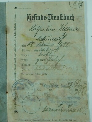 Das Gesinde-Dienstbuch wurde am 22. Dezember 1911 für die im Februar 1897 geborene Katharina Wagner vom Bürgermeisteramt der Ortsgemeinde Körperich, im Eifelkreis Bitburg-Prüm ausgestellt. Neben den persönlichen Angaben wie Alter, Statur und Augenfarbe sind die Dienstverhältnisse aufgelistet. Dem Dokument ist zu entnehmen, dass Katharina vom 31.5.1911 bis zum 27.12.1916 als Magd bei insgesamt zwei verschiedenen Arbeitgebern tätig war. Das Dienstbuch ihrer Schwester Maria Wagner liegt uns ebenfalls vor