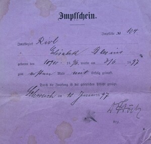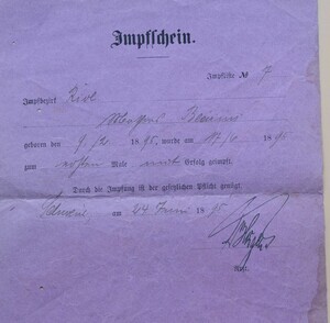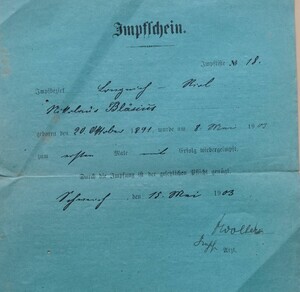 In unserem Bestand befinden sich Impfscheine der Famile Blaesius. Die geimpften sind zwischen 1888 und 1908 geboren. Es handelt sich in allen Fällen un eine sogenannte Erstimpfung die in den meisten Fällen innerhalb vom ersten Lebensjahr statt gefunden hat. Der Satz: "Durch die Impfung ist der gesetzlichen Pflicht genügt" bestätigt, dass es sich um eine Pflichtimpfung handelte.