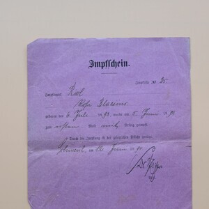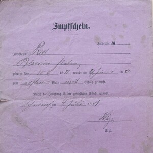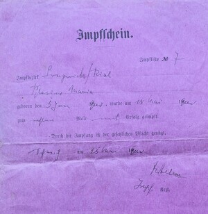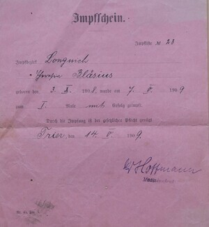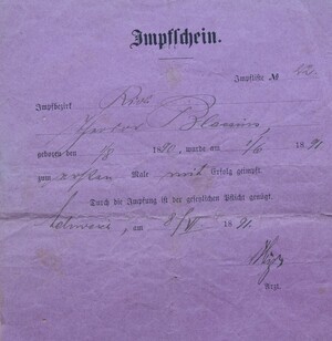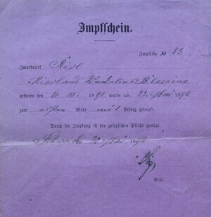 In unserem Bestand befinden sich Impfscheine der Famile Blaesius. Die geimpften sind zwischen 1888 und 1908 geboren. Es handelt sich in allen Fällen un eine sogenannte Erstimpfung die in den meisten Fällen innerhalb vom ersten Lebensjahr statt gefunden hat. Der Satz: "Durch die Impfung ist der gesetzlichen Pflicht genügt" bestätigt, dass es sich um eine Pflichtimpfung handelte.