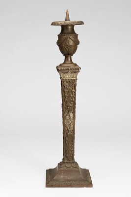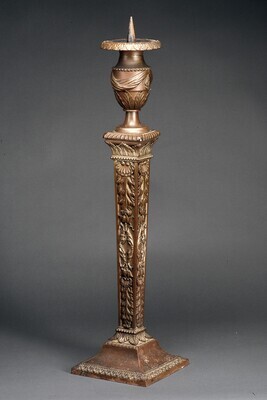 In Eisenguss gefertigter hoher Altarleuchter. Eine Vase im klassizistischen Stil ist auf eine hohe, nach unten zulaufende Säule und diese auf einen quadratischen Fuß mit nach innen eingezogenen Seiten montiert. Die Säule zeigt florale Reliefs aus Palmetten und Akanthusblättern. Dieser Altarleuchter ist sowohl im Sayner Katalog, als auch im Gleiwitzer Preis-Courant abgebildet. Die Oberfläche ist bronziert.
