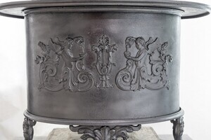 Gusseiserner ovaler Ofen mit Gießereimarke "SAYNERHÜTTE", um 1830. Dieser durch die Wand zu befeuernde Biedermeierofen mit großvolumigem Brennraum wurde mit langflammigen Brennstoffen - in erster Linie aus Astholz bestehenden sog. Reisigbüscheln - betrieben. Solche Reisigbüschel wurden noch bis in die 1930 Jahre als Brennstoff gehandelt. Der aus 6 Teilen zusammengesetzte Ofen steht mit seinen vier tatzenartig ausgebildeten Füßen auf einem flachen Steinsockel. Der Ofen weist Zierelemente im klassizistischen Stil auf, die wir beispielsweise auch von den Rückenlehnen der sog. Schinkel-Stühle kennen, nämlich die Lyra flankiert von zwei in Akanthusblättern endenden geflügelten Genien, die Öl in eine Schale gießen. Auf der Vorderseite oben ist die Gießereimarke "SAYNER / HÜTTE" in einem Zierrahmen aufmontiert.