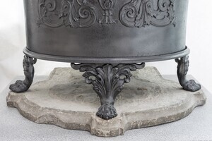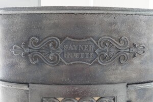 Gusseiserner ovaler Ofen mit Gießereimarke "SAYNERHÜTTE", um 1830. Dieser durch die Wand zu befeuernde Biedermeierofen mit großvolumigem Brennraum wurde mit langflammigen Brennstoffen - in erster Linie aus Astholz bestehenden sog. Reisigbüscheln - betrieben. Solche Reisigbüschel wurden noch bis in die 1930 Jahre als Brennstoff gehandelt. Der aus 6 Teilen zusammengesetzte Ofen steht mit seinen vier tatzenartig ausgebildeten Füßen auf einem flachen Steinsockel. Der Ofen weist Zierelemente im klassizistischen Stil auf, die wir beispielsweise auch von den Rückenlehnen der sog. Schinkel-Stühle kennen, nämlich die Lyra flankiert von zwei in Akanthusblättern endenden geflügelten Genien, die Öl in eine Schale gießen. Auf der Vorderseite oben ist die Gießereimarke "SAYNER / HÜTTE" in einem Zierrahmen aufmontiert.