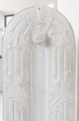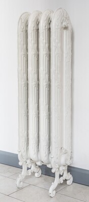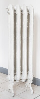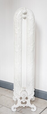 Beigeweiß lackierter gusseiserner Gliederheizkörper (4 Glieder) oder Radiator. Die Oberfläche zeigt erhaben mit gegossene Akanthusblattranken.