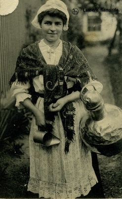 Postkarte mit Fotodruck einer flämischen Milchverkäuferin in regionaler Tracht. Auf der Rückseite eine handschriftliche Nachricht in Sütterlin. Verlag: Ern. Thill, Rue Simonis 20, Brüssel Gestempelt : 20.1.1916 Im Historischen Museum der Pfalz war vom 29.4.2014 bis 24.9.2017 die Ausstellung "1914 - 1918. Die Pfalz im Ersten Weltkrieg" zu sehen. Auf einen öffentlichen Aufruf hin meldeten sich zahlreiche Privatpersonen, ihre Objekte wurden in dieser Sammlung erfasst und z. T. auch in der Ausstellung gezeigt. Die Objekte befinden sich im Eigentum der Privatpersonen und sind nicht Teil der Sammlungen des Historischen Museums der Pfalz.