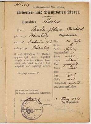 Das Arbeiter- und Dienstboten Livret wurde am 2. März 1916 von der Gemeindeverwaltung Mertert für den damals 14-jährigen Johann Backes ausgestellt. Dem Dokument ist zu entnehmen, dass er vom 3.März 1916 bis zum 18.November 1916 als Fabrikarbeiter in der Mosaikplattenfabrik „Utzschneider & Ed. Jaunez“ in Wasserbillig tätig war. Die 1865 gegründete Firma „Cerabati“ war vor dem 1.Weltkrieg unter dem Namen „Utzschneider & Ed. Jaunez“ bekannt. Das in Wasserbillig ansässige unternehmen wurde in Jahr 1990 geschloßen.