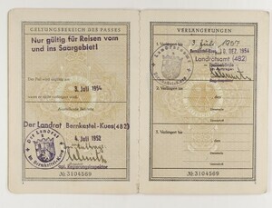 Der Reisepass wurde am 4.Juli 1952 vom Landrat Bernkastel-Kues ausgestellt. Er war bis zum 3.Juli 1954 gültig. Am 10. Dezember 1954 wurde er jedoch bis zum 3. Juli 1957 verlängert.Der Reisepass war nur gültig für Reisen vom und ins Saargebiet. Im Jahr 1953 wurde der Pass einige Male verwendet, um ins Saargebiet zu reisen.