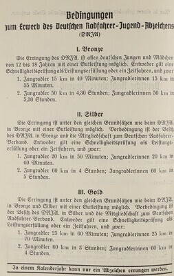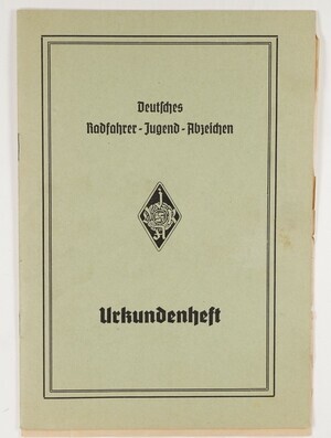 In diesem Urkundenheft für jugendliche Radfahrer befindet sich das deutsche Radfahrer-Jugend-Abzeichen in Bronze. Dieses wurde dem ehemaligen Besitzer im Alter von 14 Jahren am 11.Oktober 1937 durch den Deutschen Radfahrer Verband verliehen. Es war ihm gelungen, mit dem Fahrrad innerhalb von 36 Minuten und 5 Sekunden, 15 Kilometer zurückzulegen.