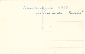 Auf dem S/W Foto ist eine Hochzeitsgesellschaft (Silberhochzeit) aus 1939 zu sehen. Umrahmt von Ihren Gästen lächelt das Jubelpaar in die Kamera. Das Hochzeitspaar und die Gäste habe sich für das Foto teils sitzend, teils stehend, hinter einem großen Tisch aufgestellt, der reichlich mit Blumenschmuck verziert ist. Auf der Rückseite ist eine handschriftliche Notiz, aus der das Jahr der Feier und der Ort, nämlich in der "Treveris" in Trier. Die Treveris war ein Portalbau der etwa um 1900 errichtet wurde. Der Bau verfügte über einen Festsaal, der für 2500 Personen konzipiert war. 1974 erfolge der Abbruch und es entstand die heutige Treveris Passage.