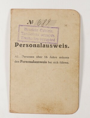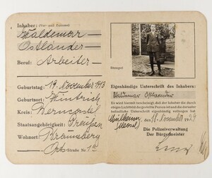 Dieser Personalausweis wurde am 18.November 1929 von der Polizeiverwaltung Mülheim, einen Tag vor dem 16. Geburtstags Waldemar Ostländers ausgestellt. Der Ausweis enthätl Angaben zum Alter, Wohn- und Geburtsort sowie Beruf des ehemaligen Besitzers. Auf der Vorderseite befindet sich ein Stempel mit dem Aufdruck „Besetztes Gebiet Territoires occupes Territories occupied“ wohl von den Militärregierungen der Sieger des 2. Weltkrieges.