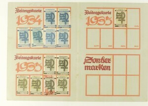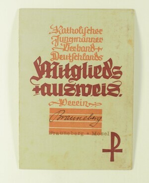 Mitgliedskarte des Katholischen Jungmänner Verbands Deutschlands, Ortsgruppe Brauenberg. Die Mitgliedskarte enthält die Beitragskarten der Jahre 1934 bis 1935, die bis zum August 1935 mit monatlichen Marken ausgefüllt sind. Diese katholische Jugendorganisation war in der Weimarer Republik sehr populär, wurde im Jahr 1939 jedoch von den Nationalsozialisten aufgelöst.