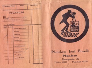 Aussenseite einer Schutzhülle für Negative. Auf der Hülle ist rechts der Name und die Anschrift der ausführenden Firma, Photohaus Josef Brendle, München, zu sehen. Auf der linken Seite stehen rechnungstypische Daten wie Name des Auftraggebers und auszuführende Arbeiten im Detail sowie Preis der ausgeführten Arbeiten. Auf der Innenseite, welche auch eine Tasche beinhaltet, ist weitere Werbung für Foto- und Entwicklerzubehör, sowie Fotoalben zu sehen.