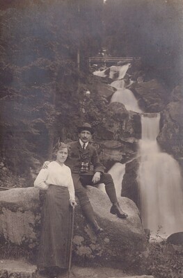 Zu sehen ist das Brautpaar Luise und Ludwig Savelkouls auf Hochzeitsreise. Die beiden rasten auf einer Wanderung am Triberger Wasserfall im Schwarzwald, welcher in mehreren Kaskaden zu Tale kommt. Die Frau trägt einen gestreiften Rock und eine weiße Bluse. Sie stützt sich auf einen Wanderstock. Der Mann, ebenfalls in Wanderschuhen, trägt einen Hut und sitzt auf einem Felsen. Den Arm hat er um seine Frau gelegt. Das Bild trägt die Aufschrift "1914 Hochzeitsreise Triberg".
