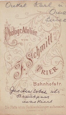 Zwei Kinder, Karl und Luise, sind als Brautpaar verkleidet. Karl trägt einen Zylinder mit Blume, ein weißes Halstuch halblange Hosen sowie Schuhe mit Schnallen. In der Hand hält er einen Stab mit bunten Bändern wie er für einen Hochzeitsbitter üblich ist. Seine "Braut" Luise trägt ein weißes Kleid mit Schleier. In der linken Hand hält sie einen Blumenstrauß, der auf die Blume am Zylinder abgestimmt ist. Über die rückseitige Werbung des Fotoateliers Schmitt aus Trier ist handschriftlich vermerkt: Onkel Karl und Tante Luise, Geschwister als Brautpaar maskiert.