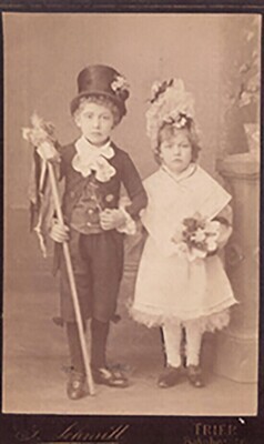 Zwei Kinder, Karl und Luise, sind als Brautpaar verkleidet. Karl trägt einen Zylinder mit Blume, ein weißes Halstuch halblange Hosen sowie Schuhe mit Schnallen. In der Hand hält er einen Stab mit bunten Bändern wie er für einen Hochzeitsbitter üblich ist. Seine "Braut" Luise trägt ein weißes Kleid mit Schleier. In der linken Hand hält sie einen Blumenstrauß, der auf die Blume am Zylinder abgestimmt ist. Über die rückseitige Werbung des Fotoateliers Schmitt aus Trier ist handschriftlich vermerkt: Onkel Karl und Tante Luise, Geschwister als Brautpaar maskiert.