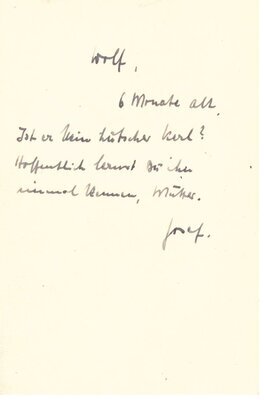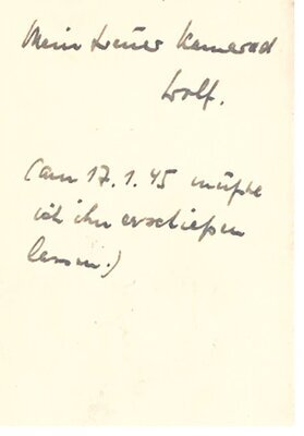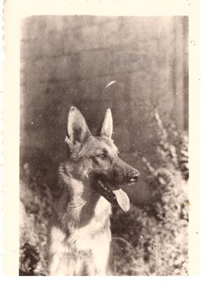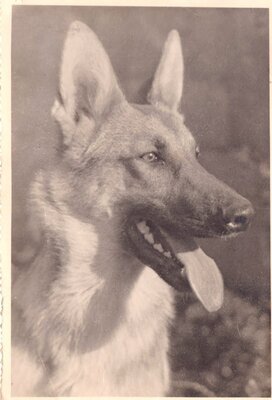 Ein deutscher Schäferhund namens "Wolf". Er sitzt aufrecht und hat aufmerksam die Ohren aufgestellt. Seine Zunge hängt ihm aus dem Maul und seine makellosen Zähne sind zu sehen. Auf der Rückseite der Karte steht "Wolf, 6 Monate alt. Ist er nicht ein hübscher Kerl? Hoffentlich lernst Du ihn einmal kennen, Mutter. Josef". Auf einem weiteren, kleineren Abzug des gleichen Negativs stehen die folgenden Worte: "Mein treuer Kamerad Wolf. (am 17.01.45 musste ich ihn erschießen lassen.)