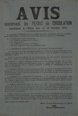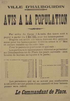 Wandanschlag in französischer Sprache. Herausgegeben im von Deutschland besetzten Frankreich; Haubourdin, den 26. April 1915. Die Passierscheine müssen bis zum 1. Mai 1915 im Rathaus präsentiert werden, um eingetragen und numeriert zu werden. Wer einen Passierschein erhalten möchte, muss sich ab sofort im Rathaus vorstellen. "Arrêté 1. Tous les laissez-passer doivent être présentés jusqu’au 1er Mai 1915, à la Mairie pour être inscrits et numérotés. Les porteurs de laissez-passer non inscrits jusqu’à cette date seront punis d’amende et privés de leur laissez-passer. 2. Dorénavant les personnes qui veulent obtenir des laissez-passer doivent se présenter à la Mairie où le laissez-passer sera formulé, ensuite ils se rendront pour la signature aux heures de bureau au Commandement de Place."