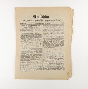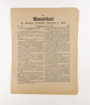 Sammlung mit insgesamt 109 Exemplaren des „Amtsblatt der königlich preußischen Regierung zu Trier“. In der Sammlung befinden sich Ausgaben der Jahre 1868, 1889, 1891, 1897 und 1900. In diesem Amtsblatt informierte die königlich preußischen Regierung zu Trier über neue Gesetze, personelle Entwicklungen und Bekanntmachungen. Der erste Teil eines jeden Amtsblattes beinhaltete zudem Teile der neusten Gesetzessammlungen oder Verordnungen. Das Amtsblatt der königlich preußischen Regierung zu Trier erschien in wöchentlichen Abständen donnerstags und war meist nur ein paar Seiten lang.