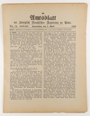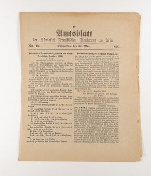Sammlung mit insgesamt 109 Exemplaren des „Amtsblatt der königlich preußischen Regierung zu Trier“. In der Sammlung befinden sich Ausgaben der Jahre 1868, 1889, 1891, 1897 und 1900. In diesem Amtsblatt informierte die königlich preußischen Regierung zu Trier über neue Gesetze, personelle Entwicklungen und Bekanntmachungen. Der erste Teil eines jeden Amtsblattes beinhaltete zudem Teile der neusten Gesetzessammlungen oder Verordnungen. Das Amtsblatt der königlich preußischen Regierung zu Trier erschien in wöchentlichen Abständen donnerstags und war meist nur ein paar Seiten lang.