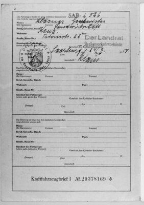 Kraftfahrzeugbrief für den Traktor Deutz D 15, mit dem amtlichen Kennzeichen SAB – L 526. Die Erstzulassung erfolgte im Febr. 1959 auf die Geschw. Klasner, aus Konz. Der Traktor wurde 2009 dem Museum geschenkt, wo er heute noch im Einsatz ist. Lt. KFZ Brief hat die Maschine einen Hubraum von 850 ccm u8nd eine Leistunt von 14 PS bei 2400 U/min. Wetere Details sind können den Fotos entnommen werden.