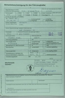 Der Ersatz-Fahrzeugbrief für die Ackerschlepper-Zugmaschine, Kramer, aus dem Jahr 1953. Ursprünglich ausgestellt für Paul Carl aus Wiltingen. 1983 erfolgte eine Ummeldung auf den Bruder, Herbert Carl, ebenfalls aus Wiltingen. In diesem Zusammenhang wurde ein Ersatz KFZ Schein ausgestellt, da das Original verschwunden war. Bis zu seiner endgültigen Abmeldung durch die Stadtverwaltung Trier am 28. August 1990 verblieb das Fahrzeug beim diesem Besitzer. Alle weiteren Details sind aus den Bildern ersichtlich