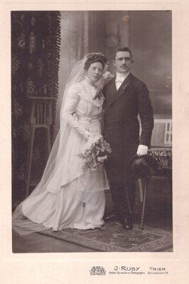 Zu sehen ist das Hochzeitspaar Theodor und Katharina Pompejus. Es ist schwer zu sagen, ob das Foto im Atelier oder in den Privaträumen aufgenommen wurde. In der Bildmitte steht die Braut ganz in Weiß. Sie lehnt sich seitlich etwas an ihren Mann an und hält den linken Unterarm auf seine Schulter gestützt. Dabei berührt sie mit der linken Hand ihre Wange. In der nach unten gerichteten, rechten Hand trägt sie ihren Brautstrauß. Sie blickt den Fotografen nachdenklich an. Daneben steht der Bräutigam im dunklen Anzug mit weißem Hemd und Stehkragen. Im Revers steckt eine Blume. Er steht gerade und schaut am Fotografen vorbei. Den Zylinder hält er in der linken Hand. Dieser Arm ist leicht angewinkelt, was dem Mann noch mehr Dynamik verleiht. Auf der Rückseite des Bildes steht "Theodor und Katharina Pompejus, geb. Savelkouls, Eltern von Paula und Marga." Unterhalb des Fotos ist der Name des Ateliers für moderne Photographie J. Ruby aus Trier aufgedruckt.