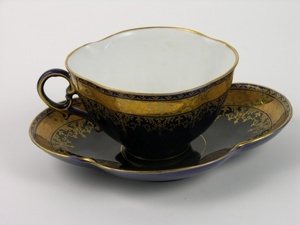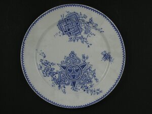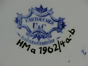 Teller aus weißer Fayence mit blauem Camaïeu-Dekor aus der zweiten Hälfte des 19. Jh. Pendant zu HM_1962_0004_b. Drei Ornamente aus geometrischen und vegetabilen Formen sind locker und asymmetrisch über den gesamten Teller (Spiegel und Fahne) verteilt. Der Tellerrand ist von einem Bogenfries umsäumt. Auf der Unterseite des Tellers verweist der blaue Stempel "Cartouches U&C Sarreguemines" auf das Unternehmen Utzschneider & Cie, einer Fayencemanufaktur in Saargemünd (Sarreguemines), die im 19. Jh. unter Paul Utzschneider (1771-1844) und später seinem Schwiegersohn Alexander von Geiger bzw. seinem Enkel Paul von Geiger zu großer Bedeutung gelangte. Sogar Napoleon zählte zum Kreis der Kunden.