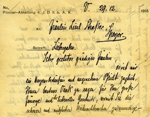 Handschriftlich verfasster Dankesbrief eines Soldaten aus dem Feld an Elisabeth Strasser für die Weihnachtsgaben vom 29.12.1915 mit dazugehörigem Umschlag. Im Historischen Museum der Pfalz war vom 29.4.2014 bis 24.9.2017 die Ausstellung "1914 - 1918. Die Pfalz im Ersten Weltkrieg" zu sehen. Auf einen öffentlichen Aufruf hin meldeten sich zahlreiche Privatpersonen, ihre Objekte wurden in dieser Sammlung erfasst und z. T. auch in der Ausstellung gezeigt. Die Objekte befinden sich im Eigentum der Privatpersonen und sind nicht Teil der Sammlungen des Historischen Museums der Pfalz.