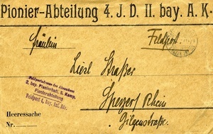 Handschriftlich verfasster Dankesbrief eines Soldaten aus dem Feld an Elisabeth Strasser für die Weihnachtsgaben vom 29.12.1915 mit dazugehörigem Umschlag. Im Historischen Museum der Pfalz war vom 29.4.2014 bis 24.9.2017 die Ausstellung "1914 - 1918. Die Pfalz im Ersten Weltkrieg" zu sehen. Auf einen öffentlichen Aufruf hin meldeten sich zahlreiche Privatpersonen, ihre Objekte wurden in dieser Sammlung erfasst und z. T. auch in der Ausstellung gezeigt. Die Objekte befinden sich im Eigentum der Privatpersonen und sind nicht Teil der Sammlungen des Historischen Museums der Pfalz.