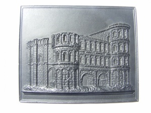 Zu sehen ist der Porta Nigra Platz in Trier. Die Porta Nigra (schwarzes Tor) wurde von den Römern ab 170 nach Christus erbaut und ist das Wahrzeichen von Trier. Auf den Foto ist eine größere Menschenmenge zu sehen, welche sich in verschiedene Richtungen verstreut. Auf dem Platz stehen mehrere elektrische Straßenbahnen, die auf Fahrgäste warten. Im Vordergrund sind etliche Autos geparkt. Das weiße Gebäude im Hintergrund ist das alte "Hotel Porta Nigra". Dieses wurde Anfang der fünfziger Jahre abgerissen und gegen einen modernen Zweckbau ersetzt, welcher ebenfalls als Hotel mit gleichem Namen genutzt wird.