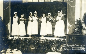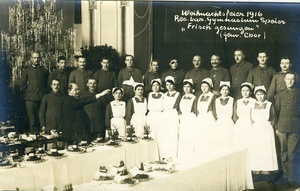 Die Aufnahme vom August 1917 zeigt verwundete Soldaten zusammen mit Schwestern vor dem Portal des königlich bayrischen Gymnasiums in Speyer, in welchem sich das Reservelazarett befand. Die rechte der beiden Schwestern ist Elisabeth Strasser, welche ab 1916 als Kriegspflegerin im Reservelazarett tätig gewesen ist. Im Historischen Museum der Pfalz war vom 29.4.2014 bis 24.9.2017 die Ausstellung "1914 - 1918. Die Pfalz im Ersten Weltkrieg" zu sehen. Auf einen öffentlichen Aufruf hin meldeten sich zahlreiche Privatpersonen, ihre Objekte wurden in dieser Sammlung erfasst und z. T. auch in der Ausstellung gezeigt. Die Objekte befinden sich im Eigentum der Privatpersonen und sind nicht Teil der Sammlungen des Historischen Museums der Pfalz.