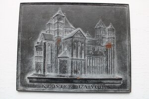Gusseiserne und geschwärzte Sayner Neujahrsplakette 1837 mit Darstellung der Abteikirche von Maria Laach im Relief. Auf dem Gussrelief sind Reste von weißem Puder zu erkennen, die darauf hindeuten, dass diese Plakette als Modell genutzt wurde. Außerdem sind mehrere Stellen mit Flugrost zu erkennen. Die für das Neujahr 1837 hergestellte Neujahrsplakette zeigt den Blick von Nordosten auf die Benediktinerabteikirche Maria Laach. Die Klosterkirche ist eine doppelchorige, dreischiffige Gewölbebasilika mit zwei Querhäusern und Chören und entsprechenden Türmen im Osten und Westen. Vor dem Westbau liegt das sog. Paradies. Auf dem Gelände ihrer Burg war 1093 die Benediktinerabtei von Pfalzgraf Heinrich II. und seiner Gemahlin Adelheid am Ufer des Laacher Sees zu Ehren der Muttergottes du des hl. Nikolaus gestiftet worden (Baubeginn). Das Modell wurde von Modelleur Carl Christian Kramer erstellt.