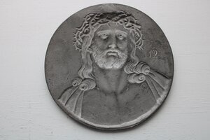 Medaillon, das Jesus Christus mit Dornenkrone, als Brustbild zeigt. Es handelt sich um ein Modell aus Zinnguss. Auf der Rückseite ist die Zahl "12" eingeritzt. Das Medaillon wurde in der Eisengießerei in Gleiwitz gegossen. Es handelt sich hierbei aber um ein Modell der Sayner Hütte. Der ursprüngliche Besitzer Paul Thewald hatte 1921 auf der Sayner Hütte seine Ausbildung zum Former begonnen.