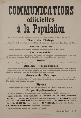 Wandanschlag in deutscher Sprache. Herausgegeben im von Deutschland besetzten Frankreich; Lille. "An die Bevölkerung! 1. - Es ist verboten, nach 10 Uhr abends auszugehen. Für Ausnahmefälle wird ein besonderer Erlaubnisschein durch den Bürgermeister ausgestellt, der seitens der Kommandantur abzustempeln ist. (Zum Beispiel an Mitglieder des roten Kreuzes). 2. - Alle Läden und Gastwirtschaften sind um 10 Uhr abends zu schliessen. 3. - Es ist verboten, Schnaps an Soldaten oder Einwohner zu verkaufen. Alle Flaschen mit Schnaps sind aus den Schaufenstern und Schränken zu entfernen. 4. - Jede Zerstörung oder Störung von Einrichtungen der Armee, insbesondere aller Telegraphen- und Eisenbahnlinien wird schwer bestraft. Ausserdem wird die Gemeinde, innerhalb deren Bereich solche Störungen vorkommen, mit einer hohen Kontribution belegt werden. 5. - Jeder, der einen Fremden beherbergt, hat mit den nötigen Angaben sofort dem Bürgermeister Anzeige zu erstatten. Kein Fremder darf in der Stadt geduldet oder zugelassen werden, der nicht einen Genehmigungsschein vom Bürgermeister erhält, den die Kommandantur genehmigt hat. Verdächtige Fremde jeder Art sind sofort der Kommandantur vorzuführen. 6. - Alles, was Angehörige der deutschen Armee für sich kaufen, wird in barem Gelde bezalt [sic] werden. Nur bei behördlichen Requisitionen für die Armee erfolgt die Bezahlung durch einen Schein. 7. - Auf den regelmässigen, Märkten werden Requisitionen nicht erfolgen Es wird hier also nichts beschlagnahmt, vielmher [sic] alles ohne Ausnahme in barem Geld bezahlt."