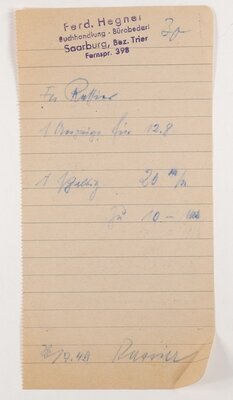 Insgesamt enthält das Konvolut etwa 150 einzelne Geschäftsunterlagen der Firma Rassier aus der Zeit von 1946 bis 1952. Diese Firma aus Saarburg hatte sich auf den Handel mit Textilien spezialisiert. In der Sammlung enthalten sind unter anderem handgeschriebene Notizen, einzelne Kontoauszüge, Rechnungen und Aufträge.