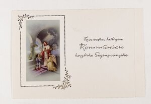 Das Konvolut enthält Andenken an die Erstkommunion von Rudolf Rassier, die am 17. April 1966 in der Pfarrkirche St. Laurentius in Saarburg stattfand. Zu der Sammlung gehören 8 Schreiben an das Kommunionkind, 11 gedruckte Dankeskarten mit dazugehörigen Umschlägen und 18 Erinnerungskärtchen mit 5 verschiedenen Motiven auf der Vorderseite.
