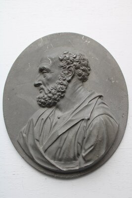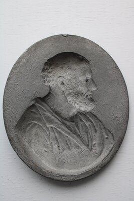 Ovales Medaillon aus Zinn gegossen und als Modell verwendet. Es zeigt das Brustbild des Apostels Petrus nach links im Hochrelief, leicht nach vorne gewendet und der Kopf im Profil dargestellt. Unterhalb des Brustbildes ist der Namenszug "PETRUS" zu lesen. Es handelt sich hierbei um ein Modell aus dem Nachlass des verstorbenen Kunstformers Paul Thewald aus Sayn. Das ursprüngliche Modell stammt von Leonhard Posch (1750-1831) aus der Zeit um 1817. Alle drei königlich-preußischen Eisengießereien in Gleiwitz, Berlin und Sayn nutzen das Petrus-Modell von Posch für die Produktion von Eisengüssen. Die Petrus- und Paulus-Reliefs mit Rahmen wurden ursprünglich in der Sayner Hütte ab Mitte des 19. Jahrhunderts bis zu ihrer Schließung im Dezember 1926 gegossen. Diese Reliefs waren sehr beliebt und wurden auch in anderen Gießereien nachgegossen u.a. auf der Concordiahütte in Bendorf-Mülhofen aber auch in der Gießerei Wölkingsthal in Mähren (Gießerei Bolikov). Wölkingsthal war neben der Gießerei Blansko, das bedeutendste Eisenwerk Mährens. Gegründet 1810 von Vinzenz Euseb Zeßner Freiherr von Spitzberger und dem Geologen Gregor Graf Rasumofsky, bestand das Eisenwerk bis 1878. Vgl. Inventare 6.019, 6.020, 6.021.