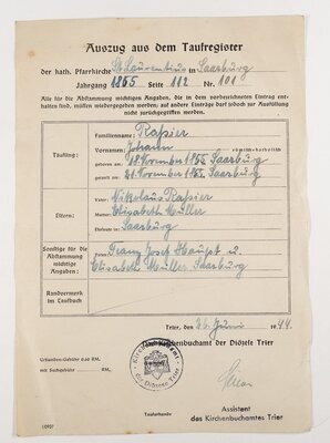 Lehrvertrag der am 15. Mai 1907 zwischen Wilhelm Rassier und Johann Rassier geschlossen wurde. Darin verpflichtete er sich Rudolf Rassier, den damals noch minderjährigen Sohn von Johann, die nächsten drei Jahre als Buchdrucker und Schriftsetzer auszubilden. Der im vorgedruckten Vertrag mit handschrifltichen Eintragungen vorgesehene Passus über die Zahlung des Lehrgeldes an den Lehrherrn wurde wohl aufgrund der verwandschafltichen Verhältnisse gestrichen.