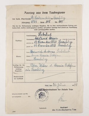 Bescheinigung über Eintragung eines Sterbefalles, die vom Bürgermeisteramt des Trierer Ortsteils Saarburg am 22. November 1937 ausgestellt wurde. In das vorgedruckte Formblatt wurde mit Stempel und Handschrift alle individuellen Angaben eingetragen. Darin wurde festgehalten, dass die 83-jährige Ehefrau von Johann Rassier am 21. November 1937 um 10:30 verstorben ist. Gleichzeitig wird damit die Erlaubnis zur Beerdigung erteilt.