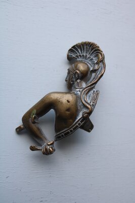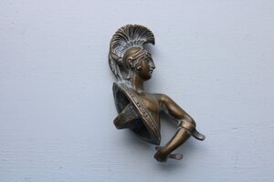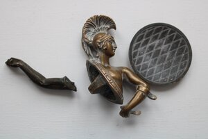 Modellteile für Briefbeschwerer bzw. Papierdrücker Speerwerfer zusätzlich mit zweitem Speerarm. Drei Modellteile aus Bronzeguss zum Abformen der Statuette des römischen Speerwerfers "Romulus", eines Papierdrückers, der im Musterbuch bzw. Katalog der Sayner Hütte angeboten wurde. Der dann in Eisen gegossene Speerwerfer wurde auf eine langrechteckige Plinthe mit umlaufendem Akanthusfries und Perlstab montiert. Die Modellteile, zu denen noch ein zweiter Speerarm und ein Ovalschild gehören zeigen Reste von weißem Puder. Nach dem Sayner Modellverzeichnis handelt es sich um die Nr. 127 "Briefhalter: Romulus" und nach dem Gleiwitzer Preiscourant von 1847 um "No. 66/67 - 6" "Fechter, kämpfend mit Speer" als Briefbeschwerer". Als Pendant gilt der "Fechter, kämpfend mit Schwert". bzw. nach dem Sayner Modellverzeichnis "Tatius". Vgl. Inventar 4.363
