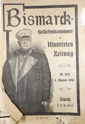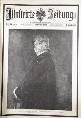 Sonderausgabe der Illustrierten Zeitung aus Leipzig vom 4. August 1898, die dem ehemaligen Reichskanzler Otto von Bismarck gewidmet ist. Die Sonderausgabe wurde höchstwahrscheinlich aufgrund Bismarcks Tot am 30. Juli 1898 publiziert. Neben den normalen Artikeln und Werbeanzeigen der Zeitung finden sich in dieser Ausgabe zahlreiche Schwarzweißabbildungen, welche die wichtigsten Ereignisse in Bismarcks Leben zeigen. Auch einige Artikel speziell über Bismarcks Leben und politisches Werk sind darin enthalten.