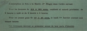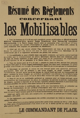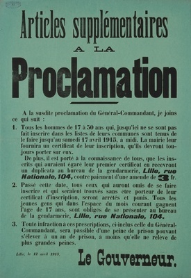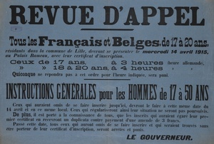 Wandanschlag in französischer Sprache, herausgegeben im von Deutschland besetzten Frankreich (Lille). Befehl an alle männlichen Franzosen, Belgier und Engländer zwischen 17 und 50 Jahren aus der Gemeinde Lille. Sie müssen sich einschreiben lassen, andernfalls werden sie als Gefangene nach Deutschland gebracht. "Tous les Français, Belges et Anglais âgés de 17 à 50 ans Habitant la Commune de Lille ont à se présenter à l’Ancienne Bourse (entrée Grande-Place), de 10 à 1 heures et de 3 à 6 heueres (heure allemande), pour se faire inscrire et recevoir un certificat d’inscription. [...] Quiconque sera arrêté sans s’être fait inscrire, sera immédiatement fait prisonnier. Le but de cette présentation est l’établissement d’une liste pour obtenir un apercu de ces personnes. Le Gouverneur de Lille."