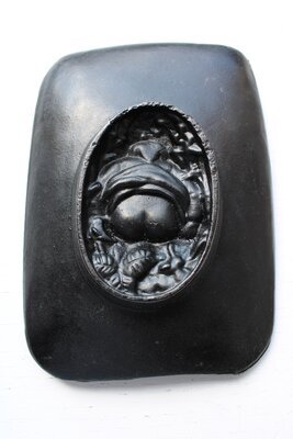 Gusseiserner rechteckiger Aschenbecher mit abgerundeten Ecken, der im Relief eine Frau mit Kopftuch, Reisigbesen und einer Schubkarre mit Laub zeigt. Im Hintergrund ist ein Schild mit der Aufschrift "HIER KANN SCHUTT ABGELADEN WERDEN" zu erkennen. Die Rückseite zeigt ein entblößtes Hinterteil. Der Aschenbecher entstand vermutlich in der Kunstgießerei der Concordiahütte. Die Oberfläche ist geschwärzt.