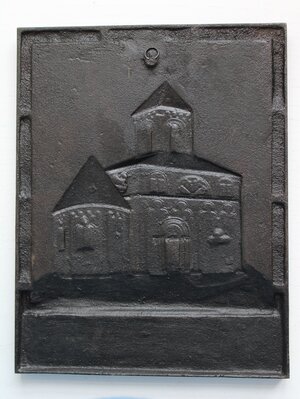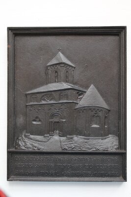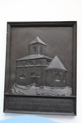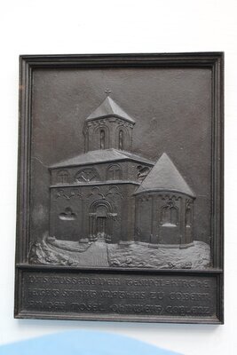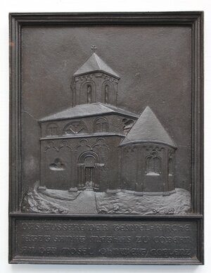 Eisengussrelief geschwärzt bzw. lackiert mit Ansicht der Matthiaskapelle in Kobern-Gondorf (Mosel) von außen. Unterhalb des Reliefs ist in einem rechteckigen Feld folgende Beschriftung zu finden: "DAS AEUSSERE DER TEMPEL=KIRCHE IETZT SANKT MATHIAS ZU COBERN AN DER MOSEL OHNWEIT COBLENZ." Das Modell wurde wahrscheinlich von Wilhelm Samuel Weigelt auf der Sayner Hütte erstellt. Das Relief und Rahmen sind aus einem Guss gefertigt. Auf der Rückseite ist eine Aufhängeöse aus Draht befestigt. Dasselbe Motiv nur verkleinert zeigt auch die Neujahrsplakette der Sayner Hütte für das Neujahr 1845. Ähnlich gestaltet und in derselben Größe existiert ein weiteres Relief, das die Innenansicht der Kapelle zeigt (vgl. F-REM 026). Das Relief stammt aus dem Nachlass des Formers Paul Thewald, der 1921 auf der Sayner Hütte seine Ausbildung begonnen hatte. Das Relief entstand womöglich in der Zeit von Thewalds Tätigkeit auf der Sayner Hütte 1921-1926/27. Vgl. Inventar F-REM 027.