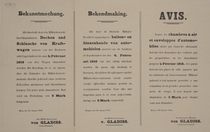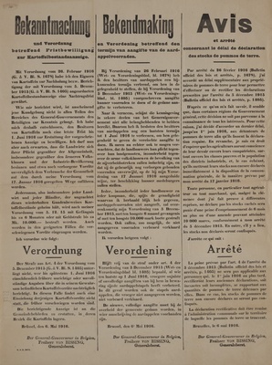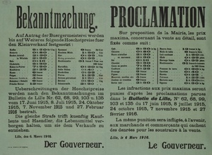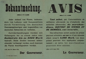 Wandanschlag in französischer und deutscher Sprache. Herausgegeben im von Deutschland besetzten Frankreich; Lille, den 23. Februar 1916. "Bekanntmachung. In letzter Zeit werden von Kaufleuten und Haendlern der Stadt Lille Lebens- und Genussmittel, die in den Verkaufsraeumen und Magazinen noch vorhanden sind, zu ganz ungewoehnlich hohen Preisen verkauft. Soweit es sich hierbei um Ueberschreiten der vom Gouvernement festgesetzten Hoechstpreise handelt, wird jeder zur Anzeige gebrachte Fall kuenftig mit der hoechst zulaessigen Strafe geahndet werden. In gleicher Weise werden von jetzt ab auch jene Faelle bestraft werden, wo Lebensmittel, fuer die auf Antrag der Buergermeisterei oder aus andern Gruenden keine Hoechstpreise festgesetzt wurden, zu Wucherpreisen verkauft worden sind. Mit der gleichen Strafe wird gegen den Kaeufer, der die uebertriebenen Preise zahlt, eingeschritten werden. In Zukunft werden nur noch Lebensmittel durch die Stadt Lille, durch das Comité d’Alimentation du Nord de la France und durch das Comité hollandais fuer den Gouvernementsbezirk eingefuehrt und unter Aufsicht der Stadt an den Abgabestellen verteilt werden. Jeder Zwischenhandel mit eingefuehrten Lebens- und Genussmitteln wird aufhoeren. Lille, den 23. Februar 1916. Der Gouverneur."